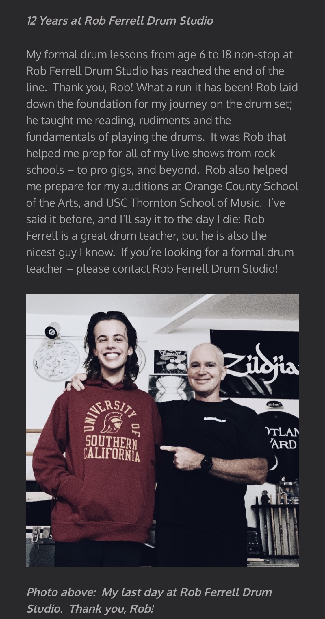 My name is Graham Spillman. I started taking lessons with Rob Ferrell in 2000 when he still was based out of Mars Music at the Block of Orange. I was 10 years old. I am now a senior in high school and have been very successful in my musical endeavors. I have spent the last 6 years at a performing arts school that required an audition to be accepted. Rob was the main reason I was able to ace the entrance audition. I have just received my early acceptance letter to attend Berklee College of Music in the fall and was also awarded a four-year partial tuition scholarship. All of my accomplishments I can attribute to the teachings of Rob Ferrell. He was my first drum set teacher. He taught me the fundamental techniques, and practice disciplines that were necessary for me to reach the level of musicality that I have. I have had the opportunity to work with many amazing musicians over the past few years but Rob will be the one music educator who will always stand out as the one who had the most impact on me. I would highly recommend Rob for students of all playing abilities. He is a noted industry professional and is one of the most personable people I have ever had the pleasure of working with. His high level of performance ability is equal to his high level of teaching ability. He made some of the most difficult musical concepts easy and tangible for me to grasp.